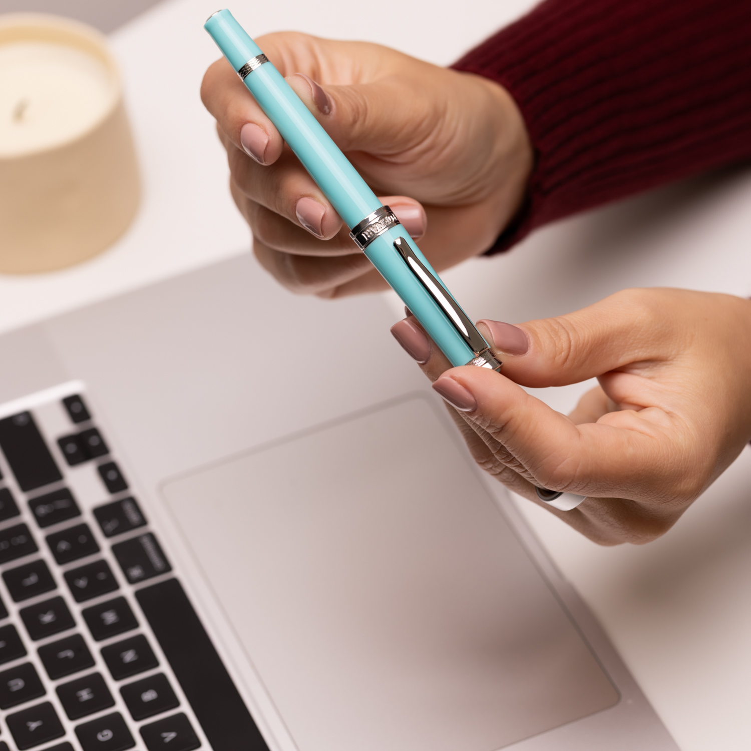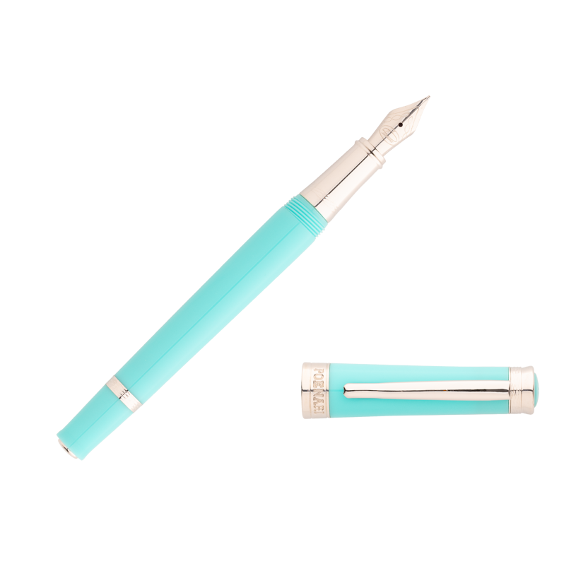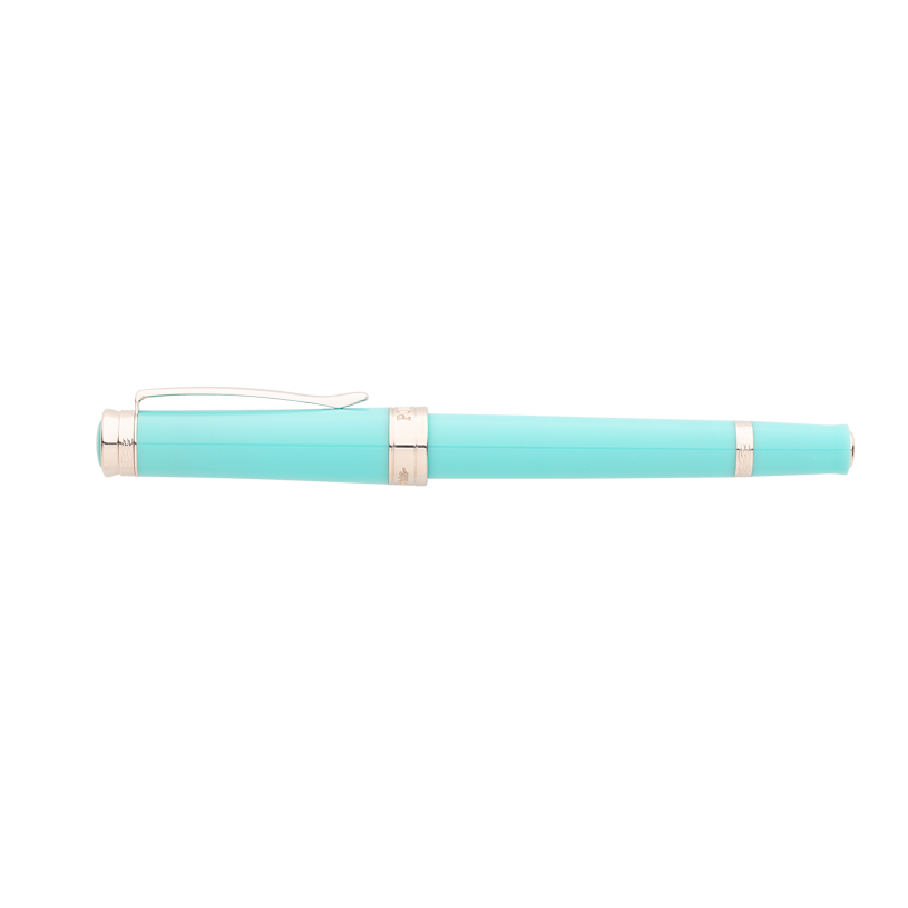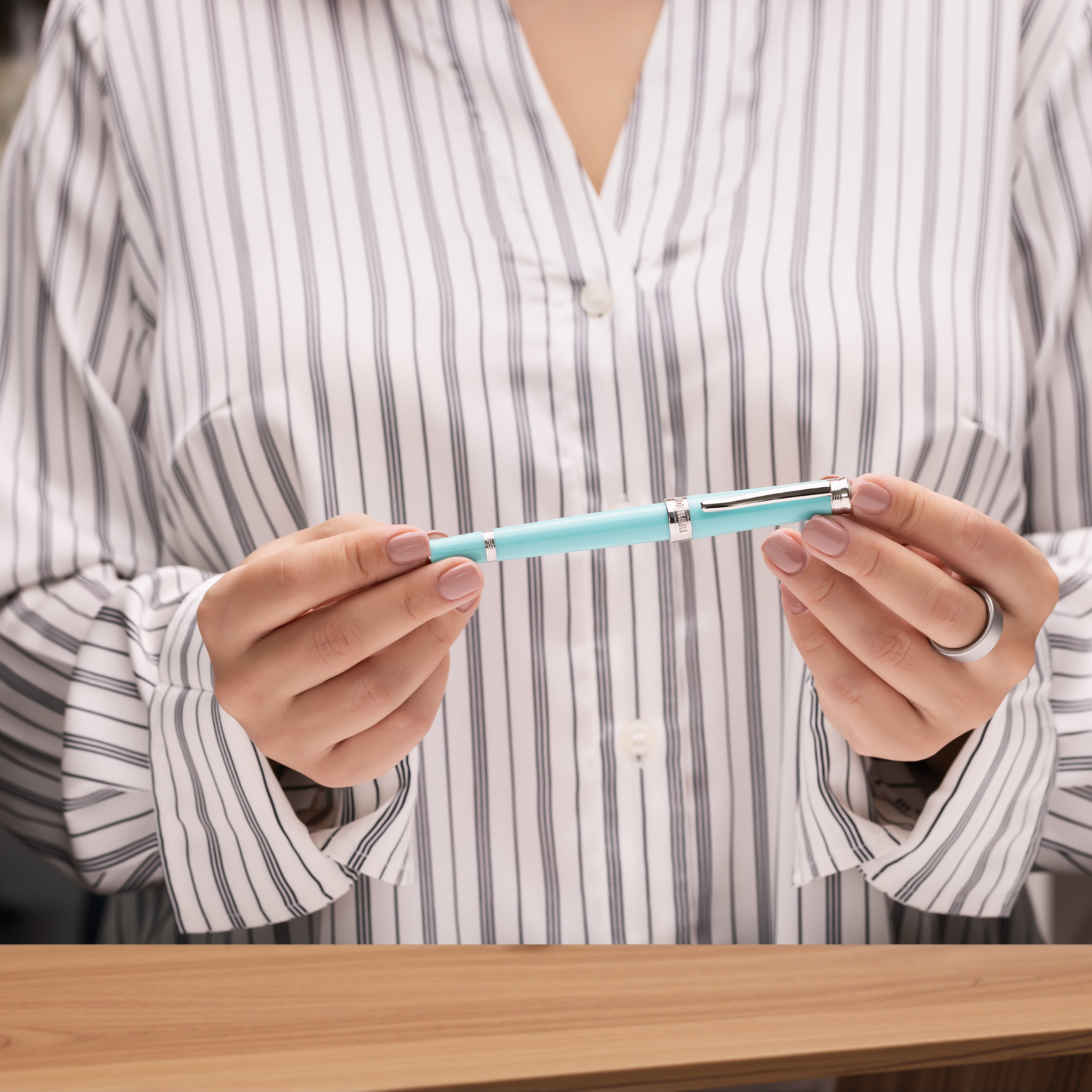 Capacul se închide prin înfiletare. Vă rugăm să nu trageți! Corpul stiloului este confecționat din rășina acrilică. Componentele metalice sunt confecționate din alamă și sunt placate cu rodiu.