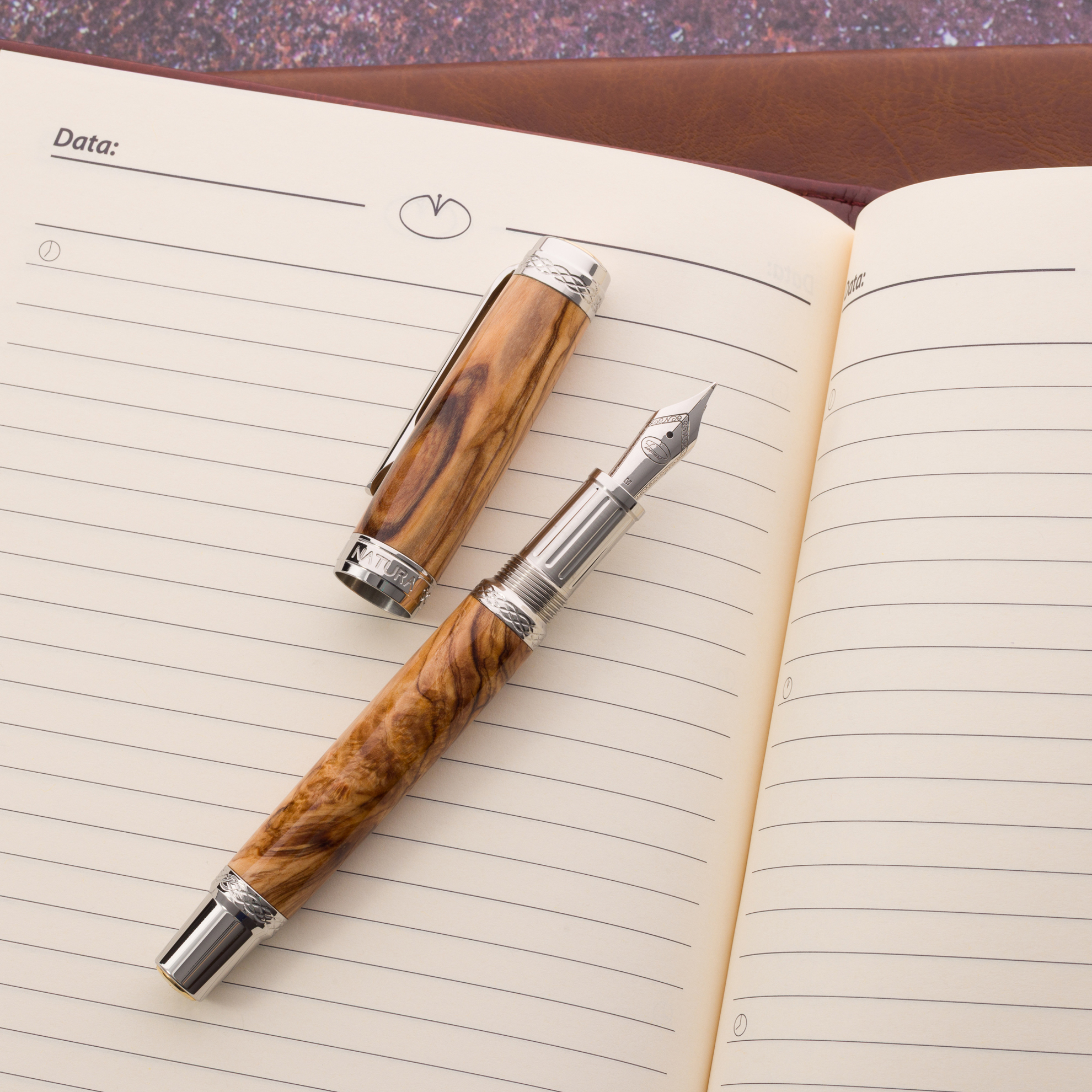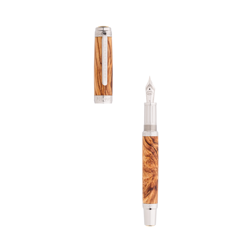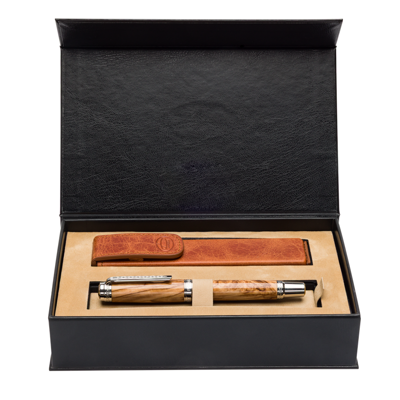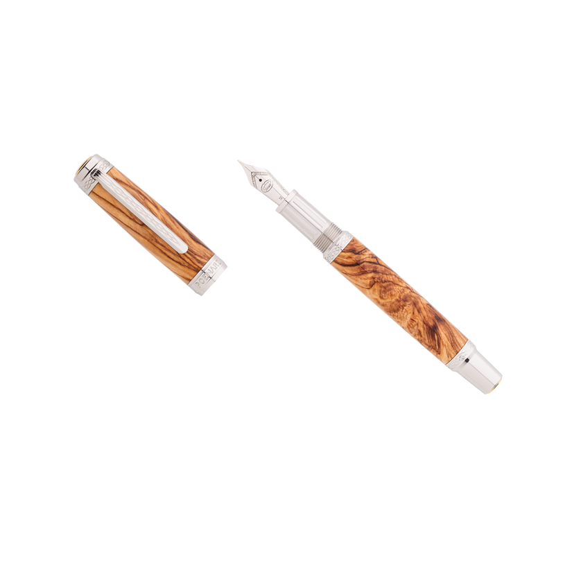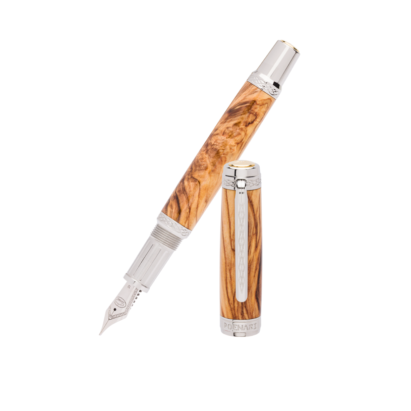 Lemnul de măslin este un lemn natural dur și dens, apreciat pentru venatura sa spectaculoasă și unică. Are nuanțe calde de crem, galben-auriu și maro, care îi conferă un aspect elegant și autentic. Fiecare stilou confecționat din acest lemn are un desen diferit al fibrei, ceea ce îl face ideal pentru realizarea de instrumente de scris unice.