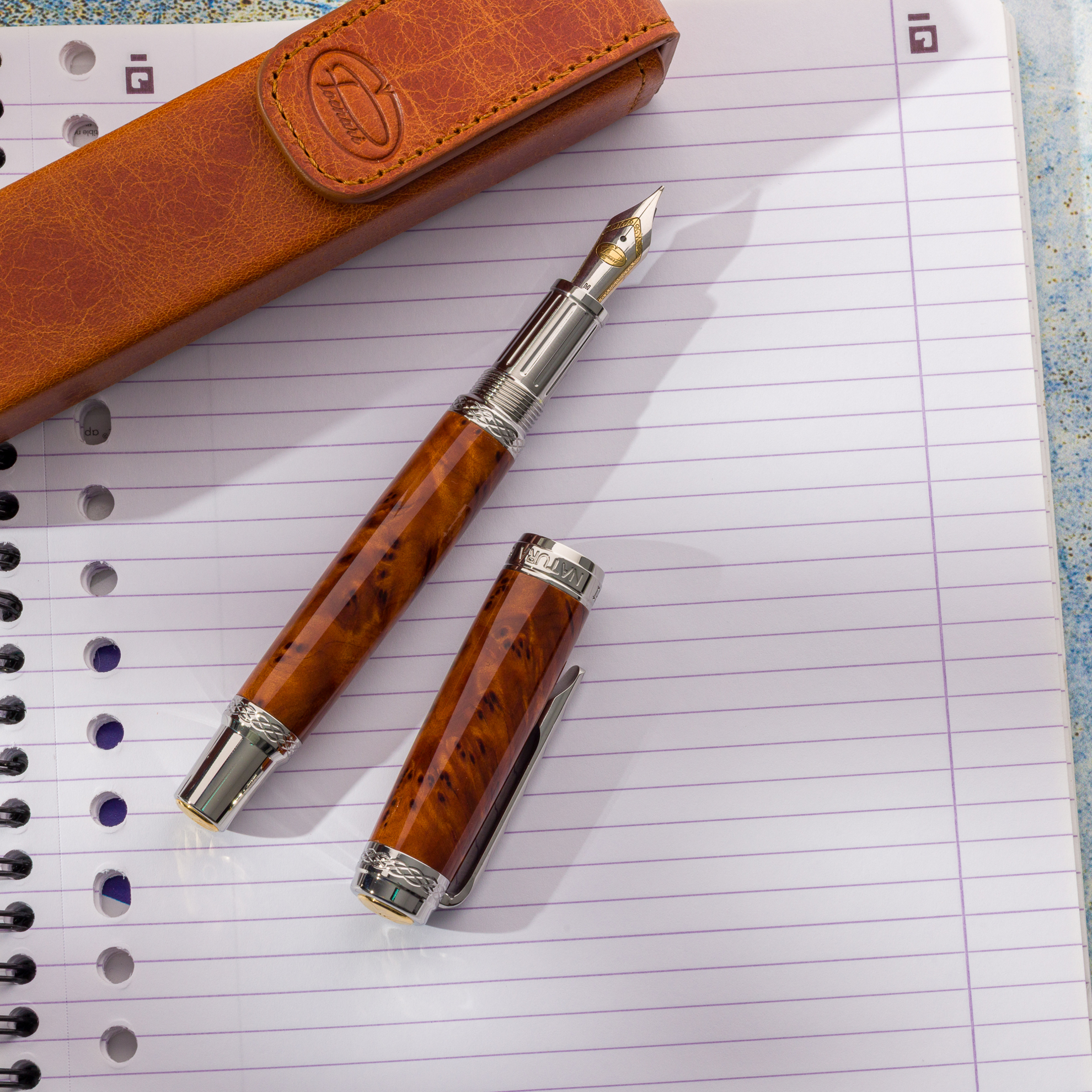 Componentele din inox adaugă un plus de durabilitate și rafinament și creează un contrast modern cu aspectul cald al lemnului. Penița stiloului este realizată din oțel inoxidabil sau din aur și oferă un flux de cerneală constant, o alunecare naturală pe hârtie și un control foate bun al literelor.